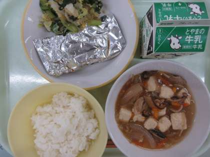 今日の献立は、ごはん、牛乳、鯖の銀紙焼き、ごまびたし、豆腐の野菜あんかけ です。