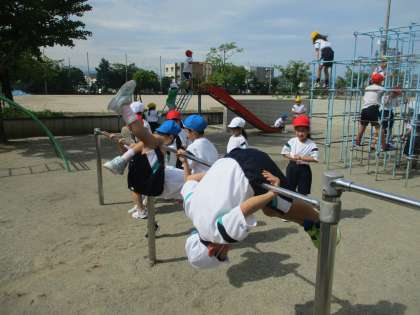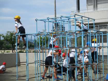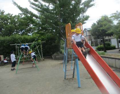 本日は、天気がよかったため、外の遊具で遊びました。体育で練習した鉄棒の技を練習したり、ジャングルジムをしたりしました。みんなで仲良く遊ぶことが上手になってきています!