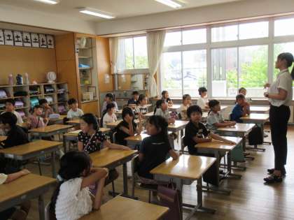 2学期の行事について担任から聞いて大喜びする子供たち。2学期は、それぞれの学年で集団宿泊学習や遠足、スケート教室等、楽しい行事が目白押しです。