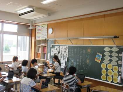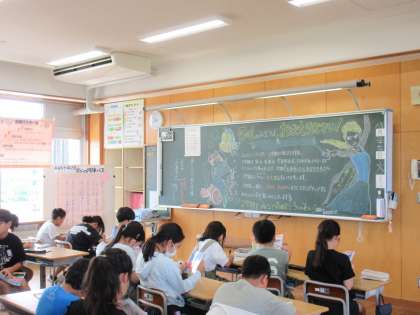 各学級の黒板に書かれた子供たちに向けたメッセージ。担任の思いが伝わる力作ばかりです。