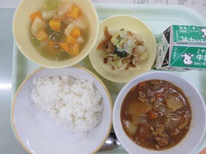 今日の献立は、カレーライス 牛乳 ふくじん和え フルーツゼリーミックス です。