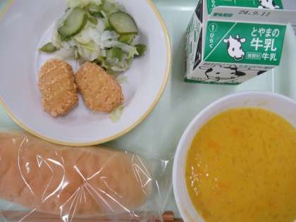 今日の献立は、コッペパン、牛乳、チキンナゲット、グリーンサラダ、かぼちゃポタージュ です。