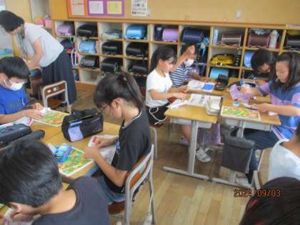 家庭科の様子です。本返し縫いや刺繍づくりに取り組んでいます。真剣な表情で、集中しています!