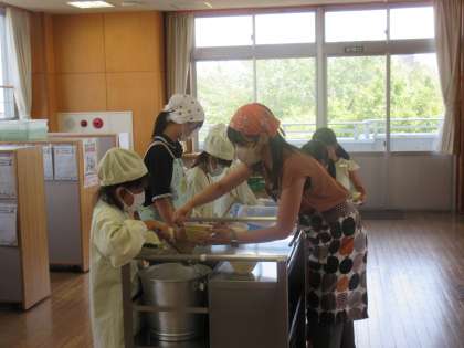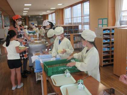 富山大学から来られた「学びのアシスト」の先生も一緒に給食の準備をしました。