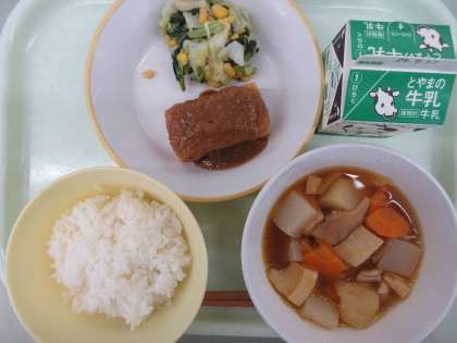 今日の献立は、ご飯、牛乳、揚げ出し豆腐のごまだれかけ、コーン和え、炊き合わせ です。