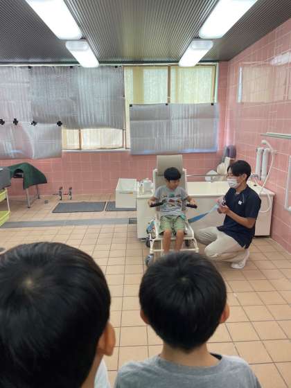 次に、敬寿苑に行きました。介護士さんの仕事を教えてもらい、施設の中を見学しました。車いす体験では、介護士さんが利用者さんに、どんな声をかけておられるのかも勉強しました。