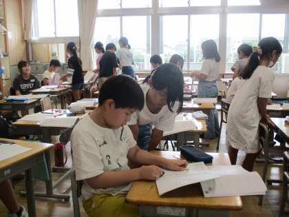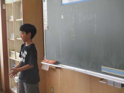 自分の考えを黒板で説明したり、困っている友達にえ方を説明したりしています。
