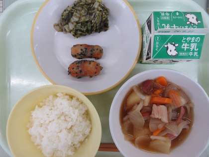 今日の献立は、ご飯、牛乳、ちくわの南部揚げ、磯和え、ベーコンとじゃがいもの煮物 です。
