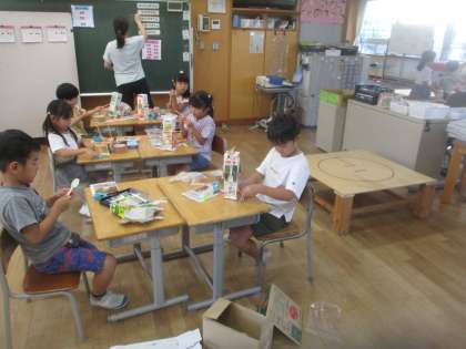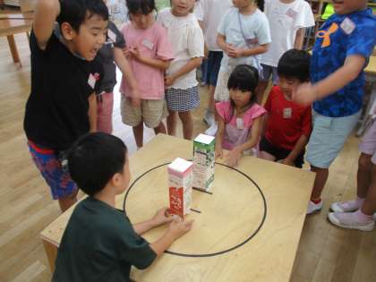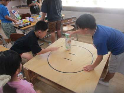 生活科では、1組がとんとんずもうをしています。強いすもうを作っています。