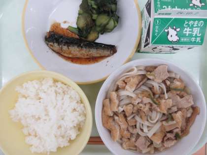 今日の献立は、ご飯、牛乳、いわしの土佐煮、とろろ昆布和え、きつねうどん です。
