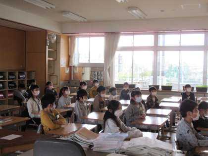 始業式にテレビ放送で参加した子供たち。その後、学級開きでは担任の話をどきどきわくわくしながら聞いていました。