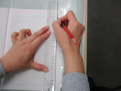 (ひだりききのひとは、みぎてで ものさしを おさえましょう。)