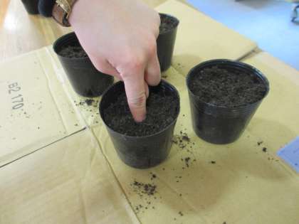 3 指の第一関節程度の穴をあけます。(見本のため、今回は一つのポットに二粒ずつ種を植えました)