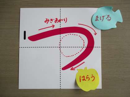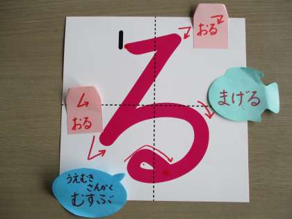 「る」・・・さいごは、うえむきの さんかくになるようにかいて、むすぶ。