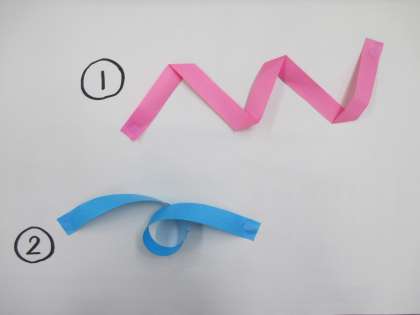 (3)リボンをまっすぐにのばして、はしをそろえてくらべる。