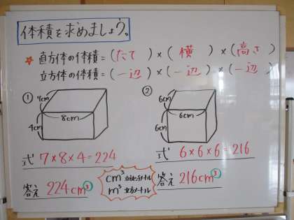 面積の単位は「平方〜」、体積の単位は「立方〜」です。体積の時は、右上に小さく「3」を書くのを忘れずに!!