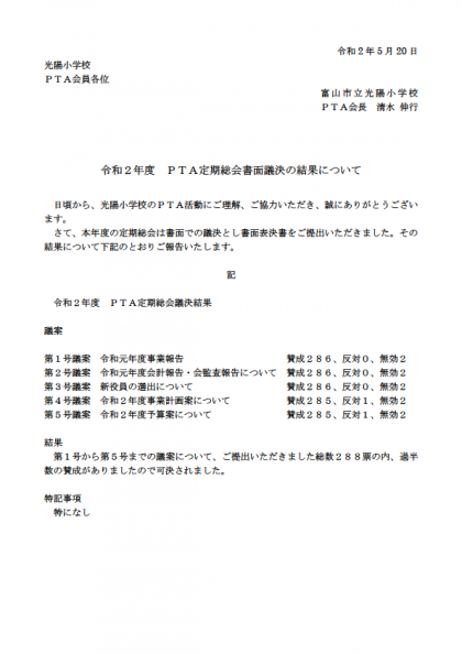 書面議決の結果につきまして、PTAより書面を受け取りましたので、掲載します。HP右の配布文書のところからもご覧になれます。ご確認ください。
