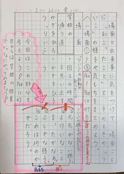 今日は、一場面(教科書P66〜P68の10行目)までです。そこから後ろのお話については、学校で先生といっしょに学習しましょう。