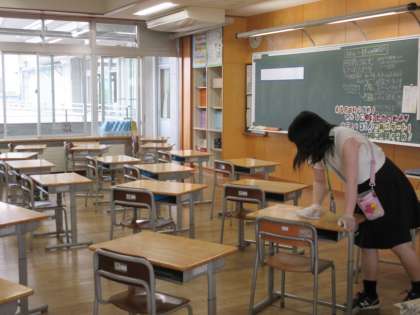 子供たちが下校した後、教職員が消毒作業を行いました。明日も元気に登校してくださいね!待っていますよ!