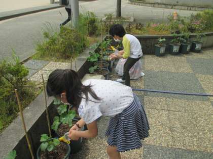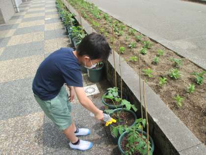 分散登校3日目。子供たちは、登校したらすぐ、進んで野菜の世話をしています。どんどん生長していく野菜の様子に喜びを感じているようでした。