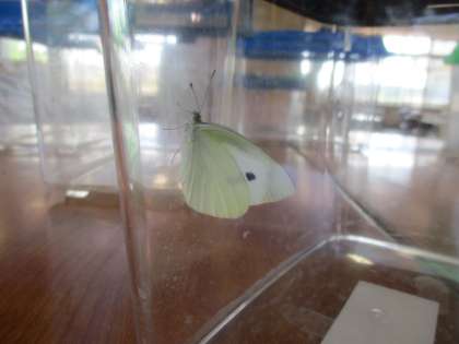 今日、虫かごを見るとモンシロチョウがさなぎから成虫になっていました。