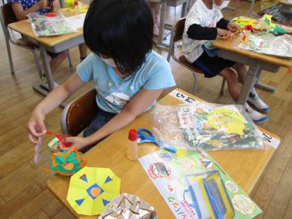 子供たちは、ハサミを使った色々な技を習得し、思い思いに折り紙を切って、すてきな飾りを作っています。
