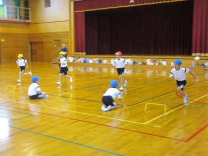 体育科の学習で「小型ハードル走」に取り組んでいます。今日は、足をどの様に上げるかを教えてもらい、練習しました。「足の裏を前に向ける」がポイントで、皆、ゴールに立っている先生に向かって、一生懸命かわいい靴の裏を見せてハードルを跳んでいました。「先生、僕の靴の裏、見えた?」「私、上手になった?」と、嬉しそうに聞いてくる子供たちの表情はとても生き生きしていました。