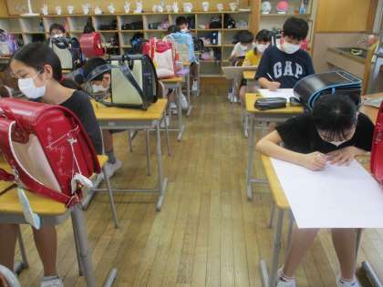 図画工作科の時間に、自分のランドセルの絵を描いています。