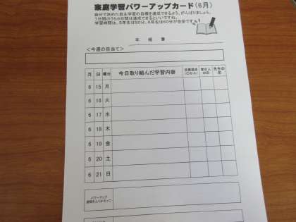今日から「家庭学習パワーアップ週間」が始まります。学校では、家庭学習の内容や目当ての立て方について指導や助言を行いますが、ご家庭でも励ましていただきますようお願いいたします。
