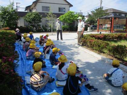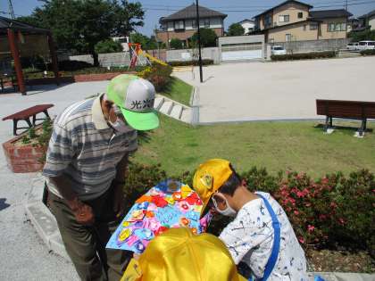 今日は、1組の子供たちが生活科の学習で、新根塚町公園へ探検に行きました。新根塚町公園のお世話をしておられる中野さんと丸田さんのお話を聞くことができました。地域の子供たちのことを思って、野菜作りや環境整備に取り組むお二人のすてきな姿に、子供たちは感動していました。
