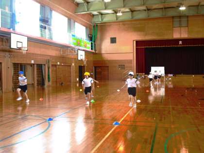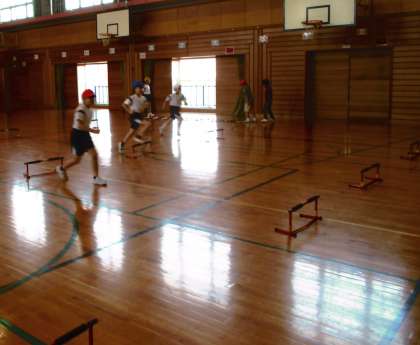 リズムに乗って軽やかにハードルをとびこえることができるよう、練習に励む子供たち。