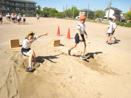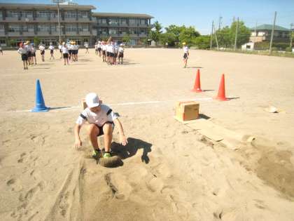 幅跳びの学習をしました。子供たちは、どうしたらより遠くへ跳ぶことができるか考え、跳んでいました。意欲的に活動していました。