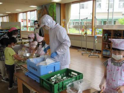 低学年の教室は調理員さんや無担任がサポートし、感染防止に気を付けながらの配膳です。