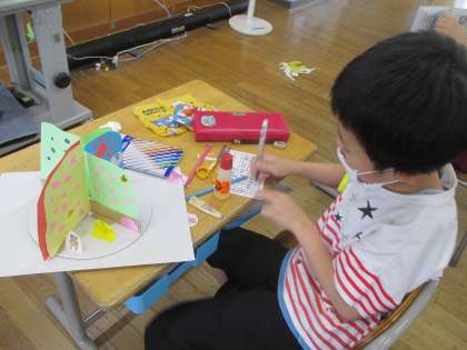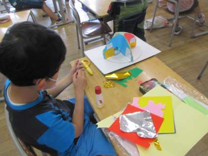 6月に入ってから、図画工作科の授業では、くるくるランドをつくっています。みんなのアイディアがあふれる、とても楽しい作品になりましたね。