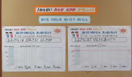 挨拶が素敵な1年生になれるように、各クラス、自分たちで「あいさつぽいんと」を考えました。1組も2組も「大きな声で」「元気に」がポイントになりました。