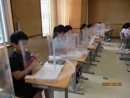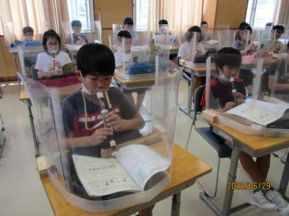 音楽室の机についたてが完成しました。久し振りにリコーダーを吹くことができました!