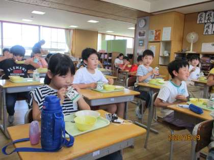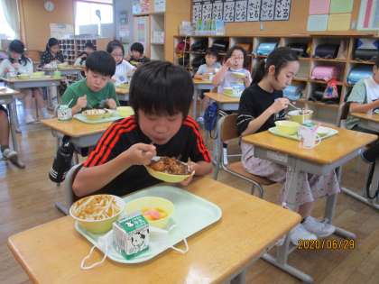 盛りつけが簡単な給食の配膳にも慣れてきました。今日は子供たちが大好きなハヤシライス!もりもり食べました。