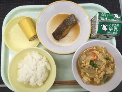 【献立】 ごはん、牛乳 揚げ魚のレモン味 親子煮 バナナ