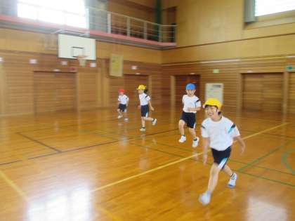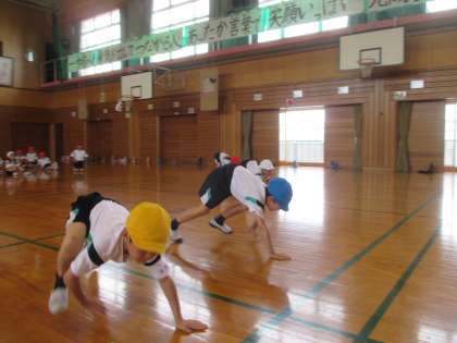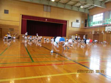 7月1日の体育の授業では、スキップや後ろ向きダッシュ、4足歩行等をしました。いつも全力で走り回る子供たちも、普段とは異なる走り方に少し苦戦しているようでしたが、楽しみながら活動できました。