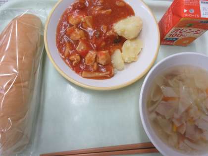 今日の給食は、牛乳ではなく、オレンジジュースでした。調理員さんに「今日はオレンジジュースだね!」と話しかける子供もおり、とても楽しみにしている様子でした。