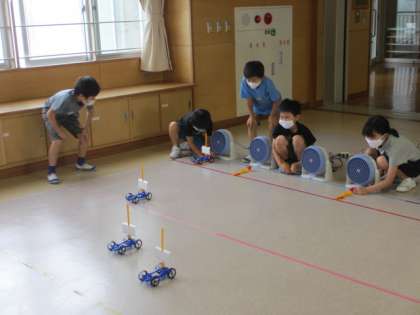 理科の学習で、風の力で車がどのくらいの距離を走ることができるのかを実験しました。今日は弱い風を車に当てて実験しましたが、明日は強い風に当てて車を走らせる実験をします。結果はどうなるでしょうか?