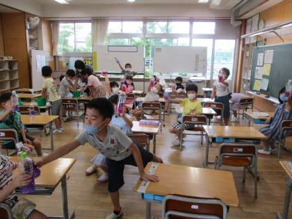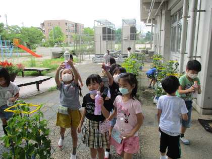 1つ、2つのアサガオをぎゅっと絞って、水の中に落としたり、