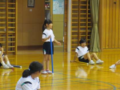 体育の学習で、体をたくさん動かしています。今日はペアが互いに棒を持ち、「せーの」で相手の持っていた棒を倒さずに取りに行く運動をしました。相手が取りやすいように棒を立ててあげることが成功の鍵だと子供たちも分かり、心を合わせて挑戦していました。