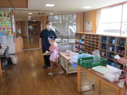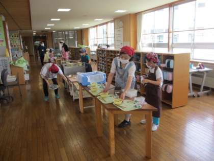 自分のエプロンを身に付けての給食当番も板につき、子供たちは衛生に気を付けながら給食の準備をしています。準備や机ふき、配膳等、自分の仕事をてきぱきとこなす姿はさすが3年生だなと感心しています。