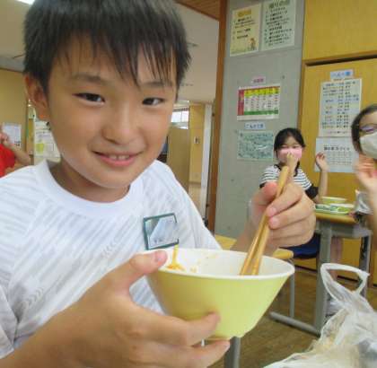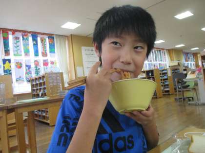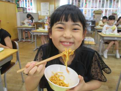 給食時の放送を通して、一番美味しく食べられる時期が「旬」であることや、旬の食材は栄養価が高いことを知った子供たちは、嬉しそうに夏野菜スパゲッティを頬張っていました。
