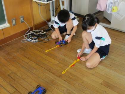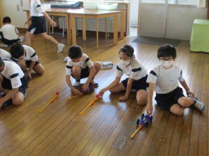 理科の学習で使用したゴムで走る車を自由に走らせました。ゴムを伸ばす距離を長くしたり、ゴムの本数を増やしたりして、遠くまで走るように工夫しました。風やゴムの力でものが動くことをしっかりと学ぶことができました。