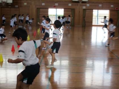 気温がぐっと高くなったため、今日の体育は体育館で行いました。今日は「速く走るこつ」を先生に教えてもらい、腕の振り方やスタートダッシュの仕方を練習しました。授業の終わりには、形のよい走り方で走ることができる人が増えてきました。