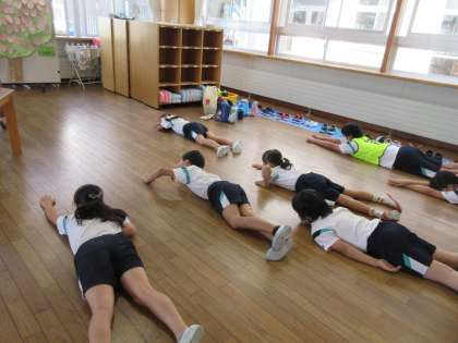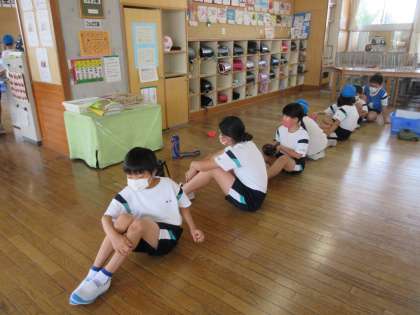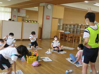 縦割り遊びを行いました。布瀬南公園とグラウンドで遊ぶ予定でしたが、朝から暑く、急遽、校舎内で活動することにしました。