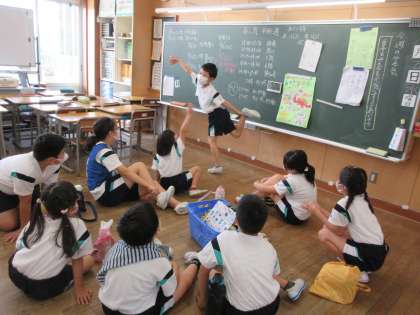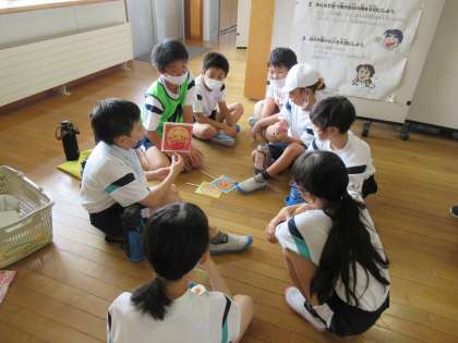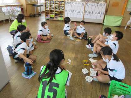 活動の最後には,班で振り返りを行いました。「とても楽しかった」「もっと遊びたかった」「本当は外で遊びたかったな」などという声が多く聞かれました。次第に班の仲間と仲良くなっていくことが嬉しい子供たちです。