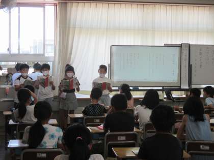 国語科の時間に「忘れもの」「ぼくは川」という詩を学習しました。それぞれの詩に出てくる「ぼく」の気持ちになって、詩を朗読する子供たちです。
